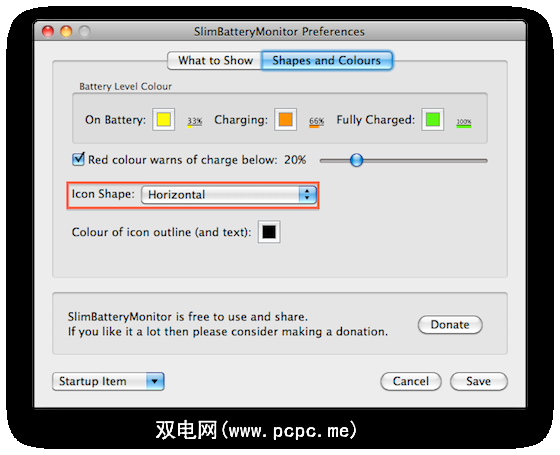关于默认的Apple电池指示器可以说些什么?嗯,这会占用很多空间,尤其是在“计算"剩余果汁用完的时间时。为了解决这个问题,只需下载并安装免费工具SlimBatteryMonitor。在首选项中将图标形状设置为水平即可。现在,将默认的电池指示器拖到菜单栏上,以将其删除。您现在有了一个更小的电池指示器。
