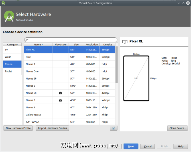 出现后,您可以单击“创建虚拟设备…"以两个步骤快速创建虚拟设备。首先,选择设备配置文件。不要花太多时间考虑它,因为它仅提供诸如屏幕尺寸和分辨率之类的参数: