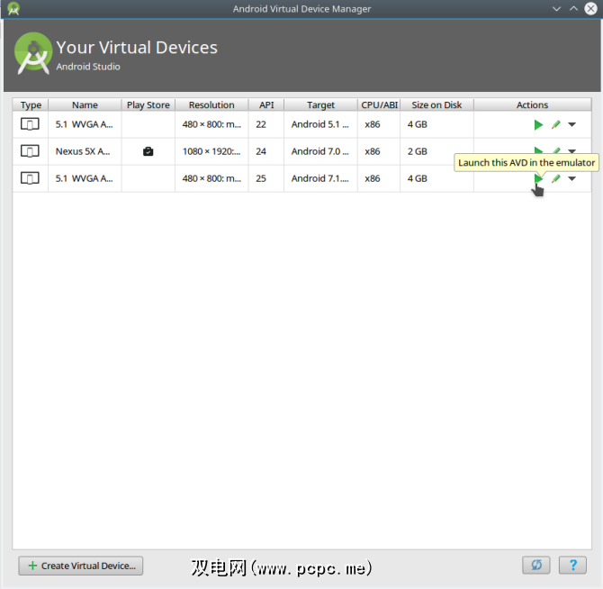 点击完成,创建虚拟设备后,使用AVD Manager中的播放按钮启动它: