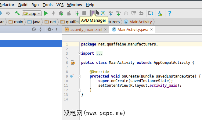 完成后,Android Studio的工具之一就是“ Android虚拟设备"经理。查找标记为(“ AVD Manager")的工具栏按钮,如下所示:
