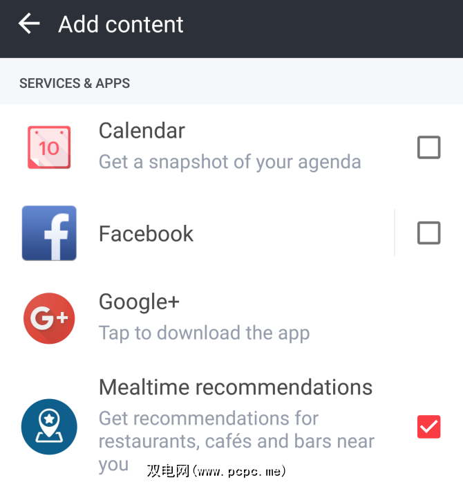 用户可以从许多受支持的应用中进行选择,包括新闻,应用提醒和社交媒体更新。也可以选择HTC的Sense Companion(在下一节中讨论)的建议,如下图所示: