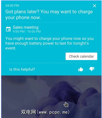 Sense Companion 将Feed式辅助学习概念,向用户提供有关餐厅,系统优化或有用提示的建议。 HTC经常引用的示例(如下图所示)是提醒您在日历上注意到即将召开的会议时给手机充电。
