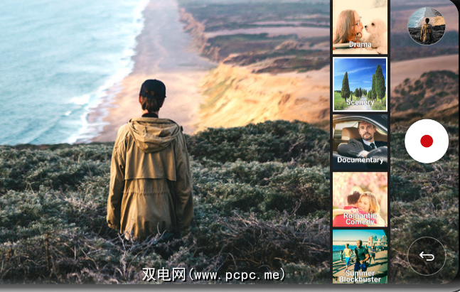 类似地,Cineffect是视频过滤器的集合,其中包含各种电影的名称。例如,“浪漫喜剧"在柔和的灯光下很亮,而“黑色"则在黑暗和沉思中。相机应用程序可让您直接应用这些滤镜(如下所示),并具有额外的好处,即它们不会降低视频质量。