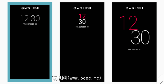 LG phones also have Always-On Displays. When configured, the phone will reduce its brightness (to prolong battery) and display the lockscreen when the phone would normally go to sleep. Users can set the display from among a variety of layouts, which can include the time, date, and other bits of information.