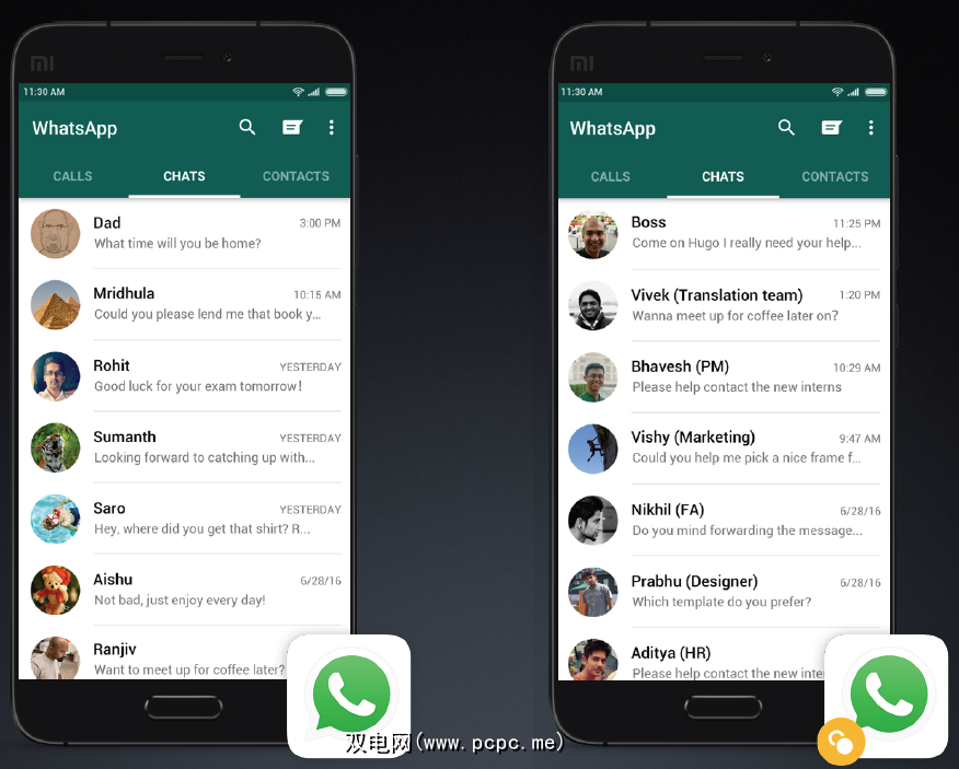 如您所见,每个WhatsApp实例都有不同的图标一组聊天,因为它们是不同的帐户。