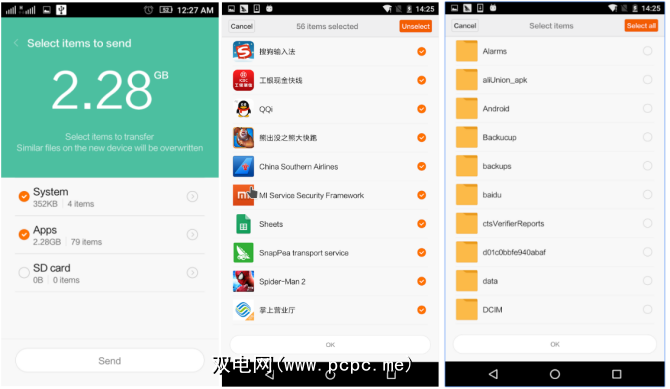 设置移动的发送者和接收者后,您可以选择要传输的项目。选择它们作为类别(如左下方所示)或按每个项目(如右图所示位于中心的应用程序和右图所示的SD卡文件)。