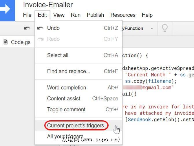 返回Google脚本,点击编辑,然后选择当前项目的触发器。