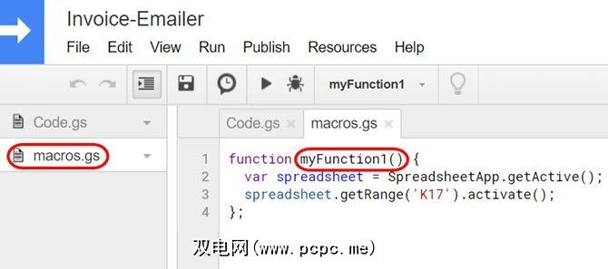 记下宏函数的名称。在上面的示例中,宏函数名称为 myFunction1 。