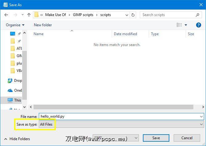 保存脚本,然后选择 All 另存为类型下拉列表中的文件。确保在文件名中包含.py扩展名。