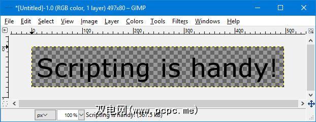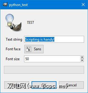 [ (PF_STRING, "customtext", "Text string", 'Scripting is handy!'), (PF_FONT, "font", "Font", "Sans"), (PF_SPINNER, "size", "Font size", 100, (1, 3000, 1)), ],像保存“ Hello,World"一样保存此内容!脚本,将其移动到plugins-ins文件夹,然后重新启动GIMP。转到文件>创建>测试尝试我们的插件。