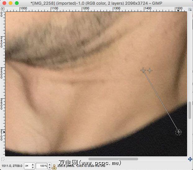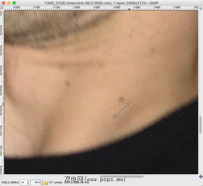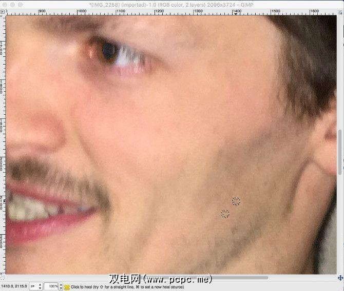 如果您要处理图像的较大部分,例如皮肤区域,修复工具是您最好的选择。它是GIMP最好的照片编辑工具之一。拍摄照片之前,我们的主题没有打扰,因此我们将整理一下。