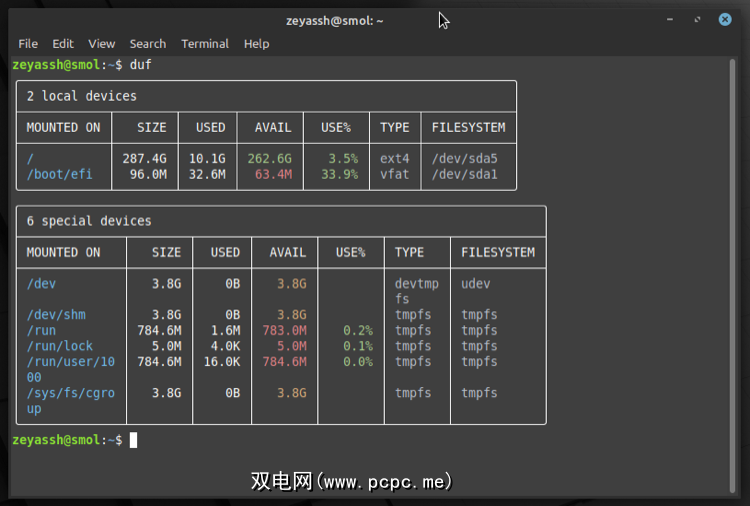 duf这将返回系统上所有设备和挂载点的列表,如下所示。
