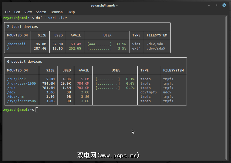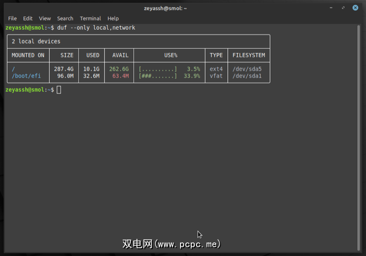 虽然这两个命令都运行良好并按预期完成工作,但还有另一个有用的命令称为duf,它是 df 的替代品,可提供更好的磁盘监控功能。