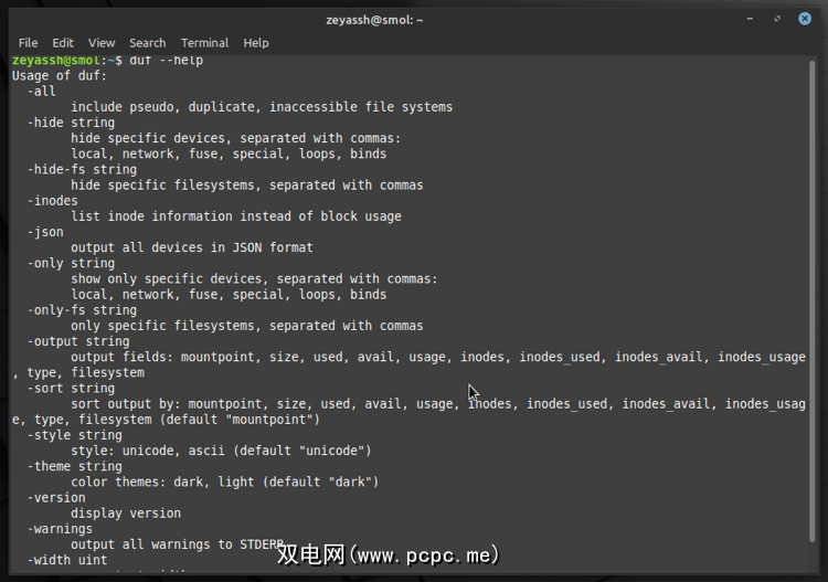 duf --theme dark在任何时候,如果您遇到命令语法方面的问题,都可以使用以下方法寻求帮助: