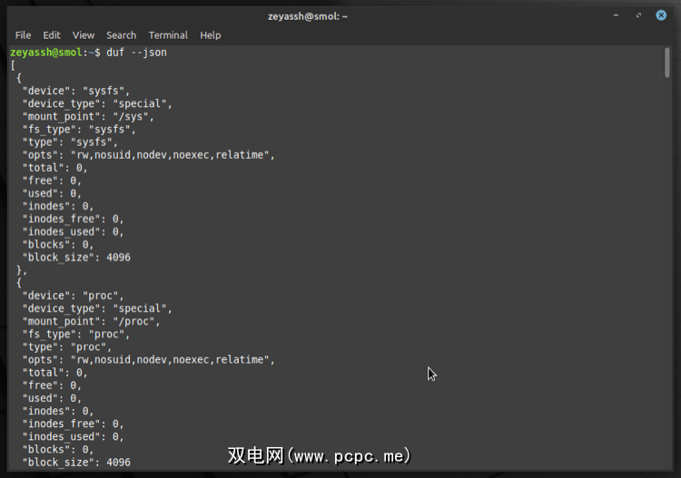 只需打开一个终端并运行以下命令以 JSON 格式导出您的 duf 结果: