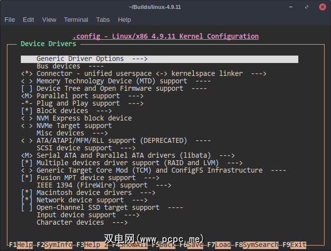 您可以切换具有<>或的菜单项按下空格键即可在它们旁边显示[] 。这将循环显示不同的菜单选项。如果在其中看到 * 或 M ,将编译该特定内核组件。它们之间的唯一区别是 M 选项将在需要时加载。例如,如果您要编译一个不经常使用的驱动程序,这将很有用。