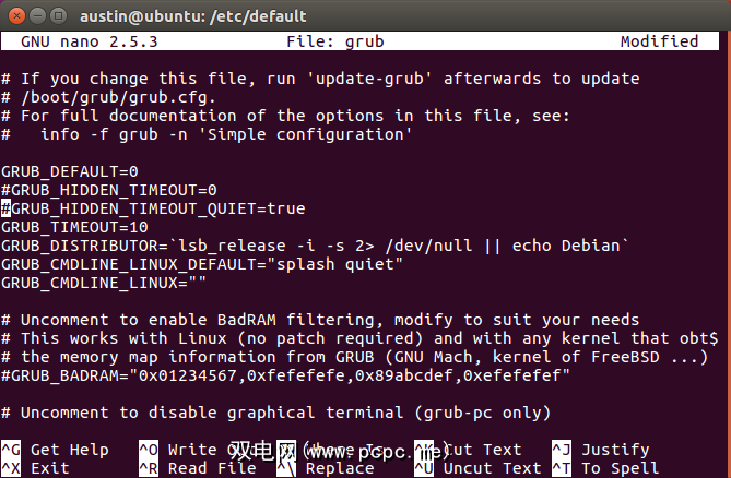 在 GRUB_HIDDEN_TIMEOUT 和 GRUB_HIDDEN_TIMEOUT_QUIET 行的前面放置#号。然后,通过运行以下命令保存这些更改: