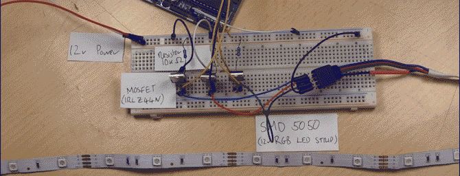 每当您控制电压高于微控制器的电压时,都需要一些电压在这两者之间,以防止您的木板被炸。一种简单的方法是使用MOSFET。通过将脉宽调制( PWM )信号发送到 gate 支路,可以控制在漏极和之间传递多少功率源腿。通过使LED灯带的每种颜色都通过MOSFET,您可以控制LED灯带上每种颜色的亮度。