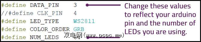 您需要更改的只是 DATA_PIN 变量,使其与引脚13 和 NUM_LEDS 变量相匹配,以定义您正在使用的灯条中有多少个LED。在这种情况下,我只使用从较长条带上切下的一小行10个LED。