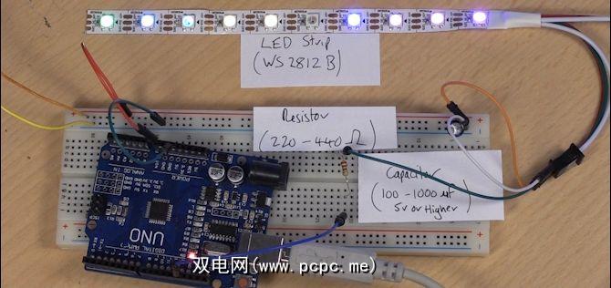 这些条带需要较少的组件来使其运行,并且有关于可以使用的组件的确切值还有一些余地。该电路中的电容器可确保5v LED获得稳定的电源。电阻器确保从Arduino接收到的数据信号不受任何干扰。