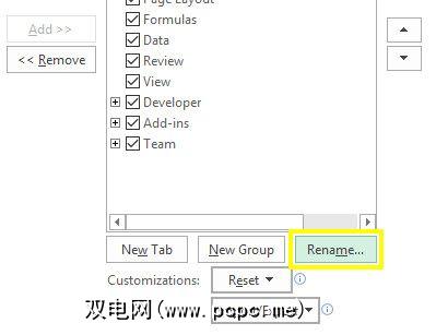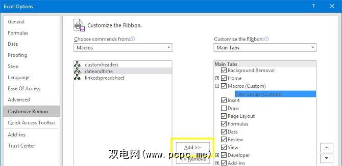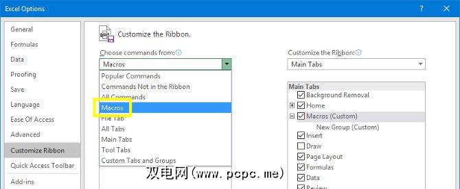 打开我们先前创建的 Macros 标签,然后右键单击功能区。选择自定义功能区。