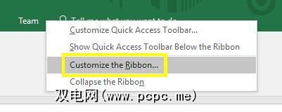 首先,我们将自己的自定义标签添加到功能区,该功能区将容纳我们的工具栏。右键单击它并选择自定义功能区。
