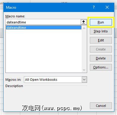 在中单击宏 >“开发人员" 标签,这一次突出显示日期和时间,然后单击运行。