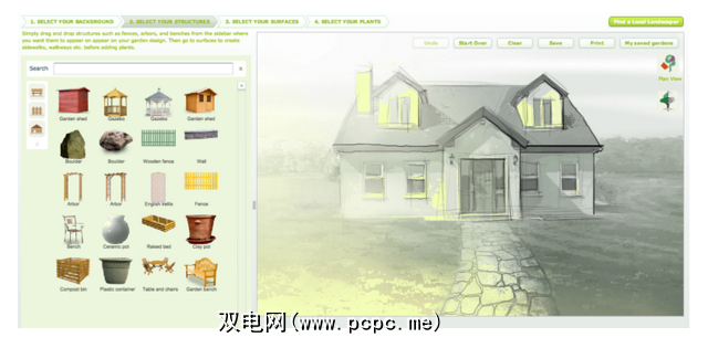 首先选择背景(设置在平房前面,或者不设置背景)例如周围的建筑物)。然后,在土地上放置墙壁和棚子之类的结构,然后选择不同的表面和植物。在站点内,您可以创建,保存和打印多个设计。