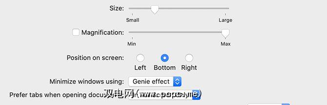 要调整扩展坞的位置,请打开系统偏好设置,然后选择停靠。在这里,您会看到屏幕上的位置项目,您可以在其中选择左,底部或右 。您还可以根据需要选择是自动显示还是隐藏停靠栏。