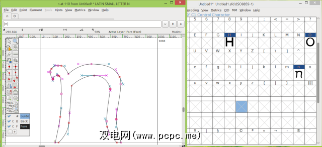 使用FontForge,您可以从简单的形状构建字体(如您所见)。我制作的“ H"和“ O"设计)和贝塞尔曲线(如您在我创建的“ n"中所见)。贝塞尔曲线可让您创建优美的下摆,卷曲和前旋效果,并通过手柄对完全控制您的喜好。