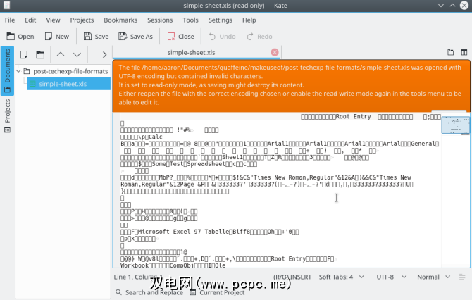 相反,二进制格式是由应用程序将其构造的文件一点点。您可以尝试使用文本编辑器打开这些文件,但可能不知道如何解释它们。下面显示了尝试使用文本编辑器打开Microsoft Excel文件的结果。