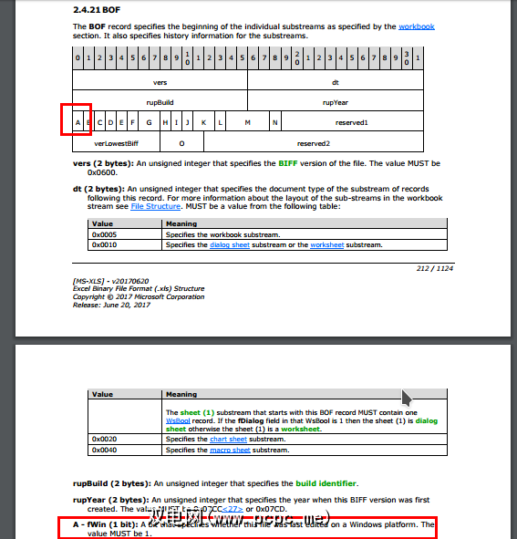 应用程序需要以特定方式处理二进制文件中的数据。打开XLS文件时,应用程序必须将文件的前16个字节视为“文件开始"(BOF)标记。在该标记内,第五项是一位,指示文件是否最后一次在Windows平台上编辑(“ fWin")。它紧随其他四个项目(每两个字节)之后,这意味着“ fWin"项目是Excel文件中的第65位。