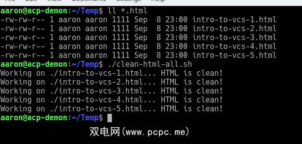 否,因为我们不是新手。我们可以将管道命令包装在“ for-each"循环中。这将依次转到当前目录中的每个HTML文件,并对其执行清理操作。让我们还通过 echo 语句添加一条消息,让我们知道所有文件都已处理完毕。
