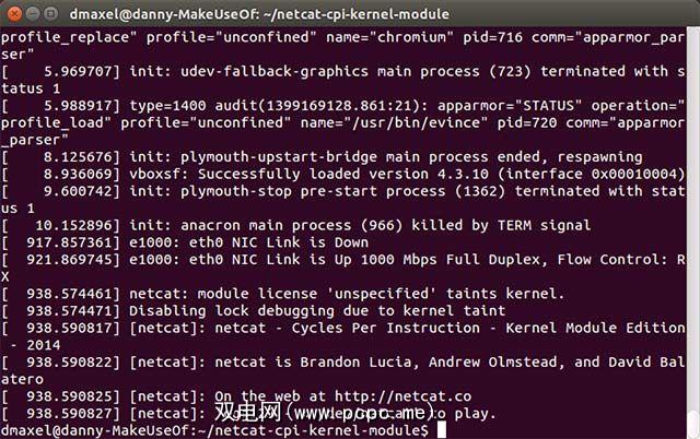 现在,您已经安装了模块,需要加载它。您可以使用命令 sudo insmod netcat.ko 进行操作。这应该启动内核模块。要进行检查,请运行命令 dmesg 并在底部附近查找类似内容: