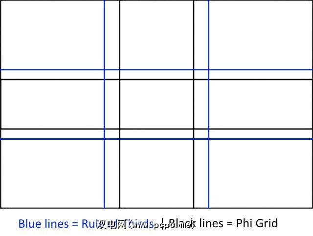 “三分法则"将一帧分为三行和三列,它们的大小相等,垂直和垂直的比例为1:1水平1:1:1 Phi网格以类似的方式分割帧,但根据黄金比例使中间行和中间列变小,从而导致垂直方向为1:1.618:1,水平方向为1:1.618:1。