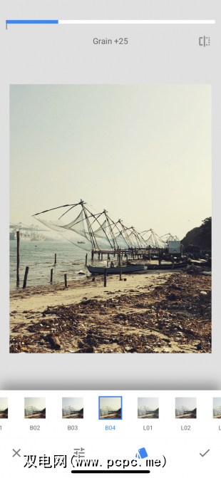粒状胶片滤镜可以为照片增添复古效果。即使您选择了子滤镜并保持较低的强度,仍然可以获得良好的效果。