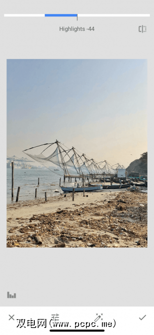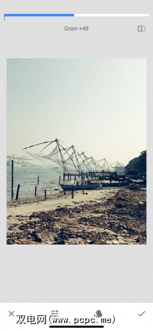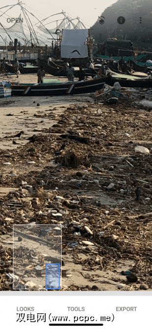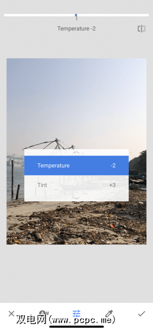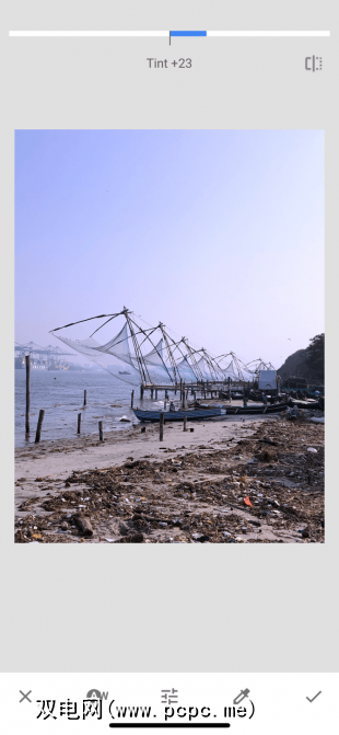 要切换到其他工具,只需向上滑动或点击底部栏中的 Tools 按钮。点击图像并按住不放,以查看原始图像和已编辑图像之间的区别。