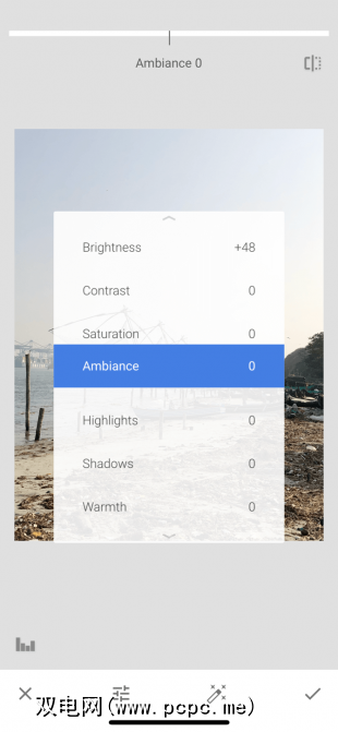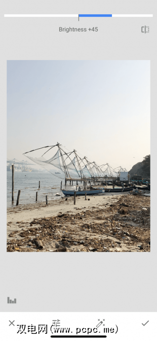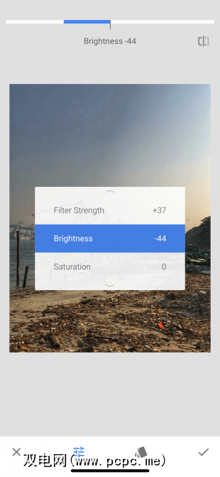 Tune Image 由以下内容组成基本的图像编辑功能,例如亮度和对比度。亮度将已经选择。您可以向右滑动以增加它,向左滑动以减小它。亮度的数值将显示在顶部。
