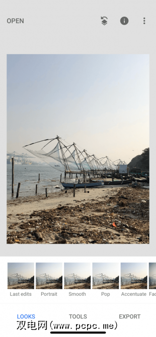 Snapseed的UI最初可能有点吓人。但花几分钟使用该应用程序,您很快就会掌握其基于手势的界面。该应用程序以简单的方式进行布局。首先打开照片,然后点击工具按钮以显示十几种不同的编辑工具。