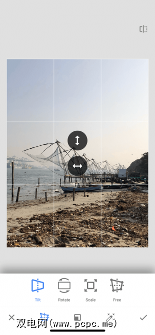 非常感谢,Snapseed具有智能的 Perspective 工具。您可以向上,向下,向左或向右滑动以更改视角。 Snapseed会巧妙地填补图片边缘的空白。但是最好是在更改透视图后裁剪掉这些边缘。