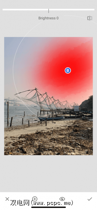 点击 Selective 选项,然后点按图像的一部分(天空或人脸),然后用两根手指捏住或捏住手指以增大或减小所选区域的大小。您可以水平滑动以在亮度,对比度,饱和度和结构之间切换。您在使用此工具时所做的所有更改将仅应用于所选区域。