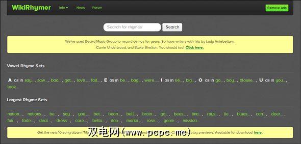 WikiRhymer是一个由社区组成的简洁网站,以传统的Wiki贡献于传统。押韵可以分为纯押韵,末押韵,近押韵,近押韵和马赛克押韵。 WikiRhymer有一个论坛可供您讨论,您可以在其中讨论诗歌,歌曲以及与元音编钟有关的任何其他内容。该站点很小,因为它是新站点,但是希望它能随着曝光而增长。
