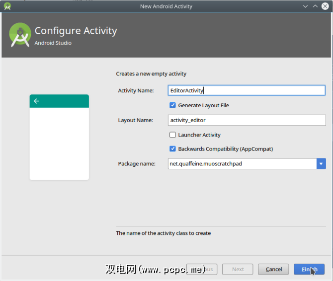 现在,我们可以关闭该应用程序,我们将重新跟踪我们的步骤。在连接“编辑"按钮之前,让我们进行“编辑器活动"(屏幕)。右键单击项目窗格,然后选择新建>活动>空活动,并将其命名为“ EditorActivity"以创建新屏幕。