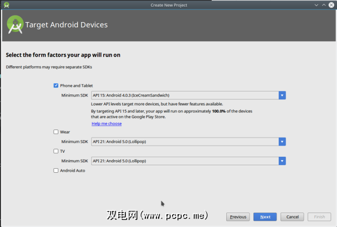 在下一个屏幕上,您将设置要定位的Android版本。选择较新的版本可让您包括平台的较新功能,但可能会排除某些设备不是最新的用户。这是一个简单的应用程序,因此我们可以继续使用Ice Cream Sandwich。