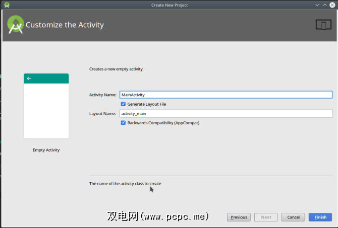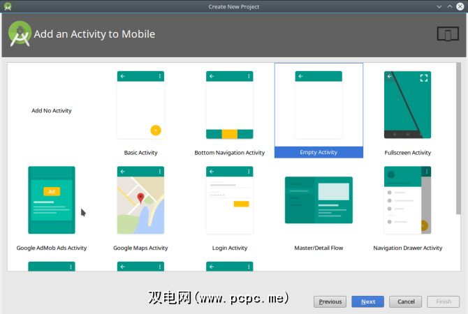 下一步,我们将为应用程序选择默认的活动。活动是Android开发中的核心概念,但出于我们的目的,我们可以将其定义为屏幕。您可以从Android Studio中选择一个数字,但我们只需要从一个空白开始并自行构建即可。之后的屏幕将为您命名。