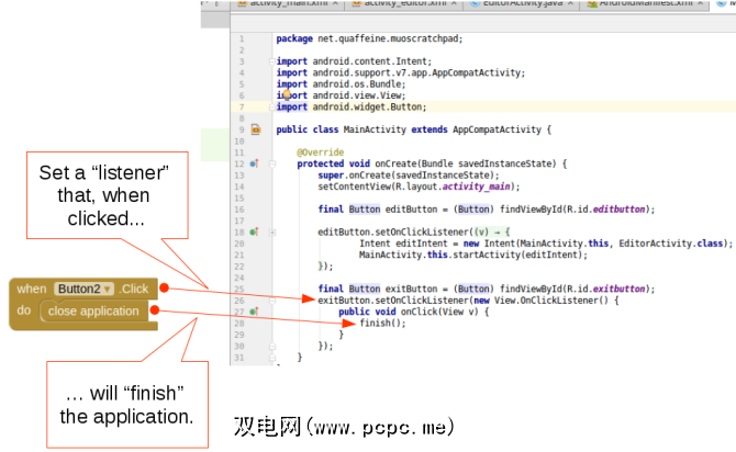 让我们连接退出按钮。与App Inventor可以为我们处理簿记的应用程序不同,我们需要以代码和图形方式创建一个Button。