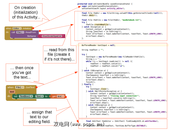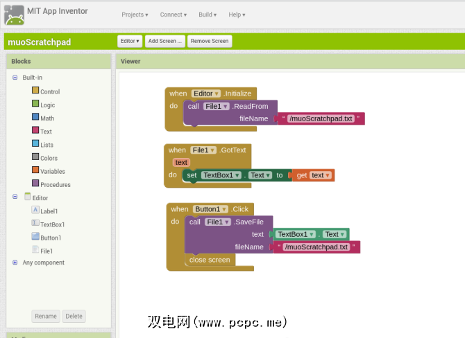 我们还设置了屏幕以在文件打开时加载该文件的内容( Editor>,在Editor.initialize 块中)。它应该调用File1.ReadFrom ,它指向我们的文件名。当File1.GotText 时,我们可以使用 File>捕获读取文本文件的结果,使用 TextBox>将TextBox.Text设置为将该内容分配给TextBox,然后将其获取文字值。最后,保存后,我们希望单击Button1将其发送回主屏幕(关闭屏幕块)。