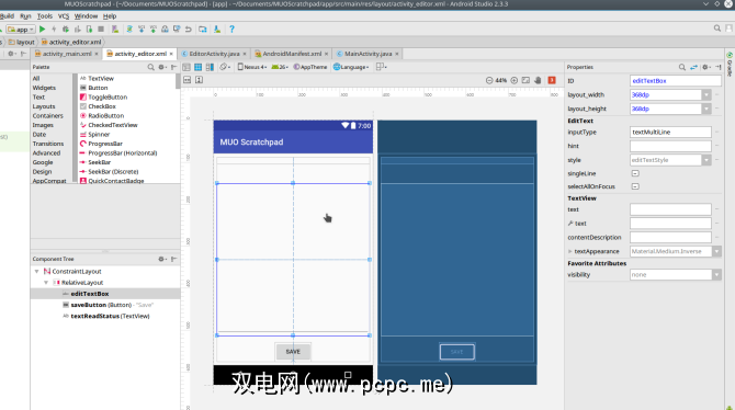 然后我们使用 EditTextBox (将在其中放置文本)和一个Button创建编辑器的布局。调整每个属性的属性。