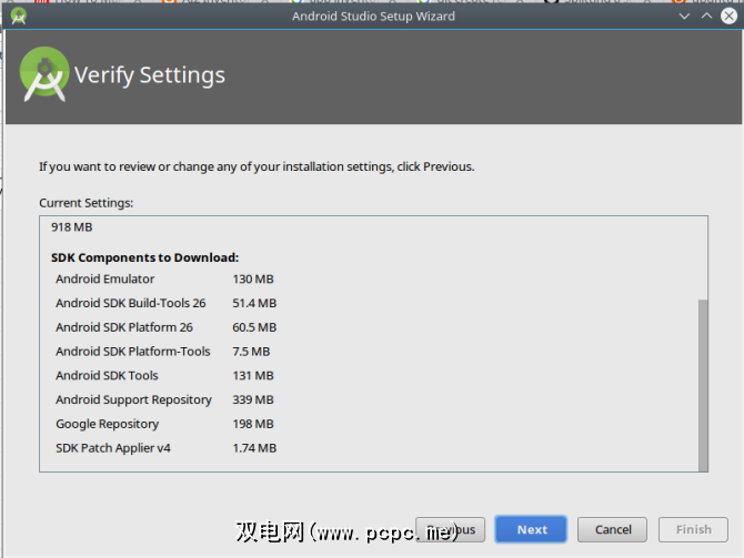 显示许可协议后,它将开始下载并安装基本应用程序。完成安装并启动Android Studio后,向导将引导您完成其他几个步骤。