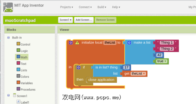 左侧选板包含如下类别“内置"类别中的控件,文本和变量。此类别中的块表示将在后台大量使用的功能,例如可以执行计算的 Math 项目。这下方是屏幕中元素的列表,此处可用的块将影响这些元素。例如,单击我们的标签之一显示的块可以更改该标签的文本,而按钮包含的块可以定义单击它们时发生的情况。